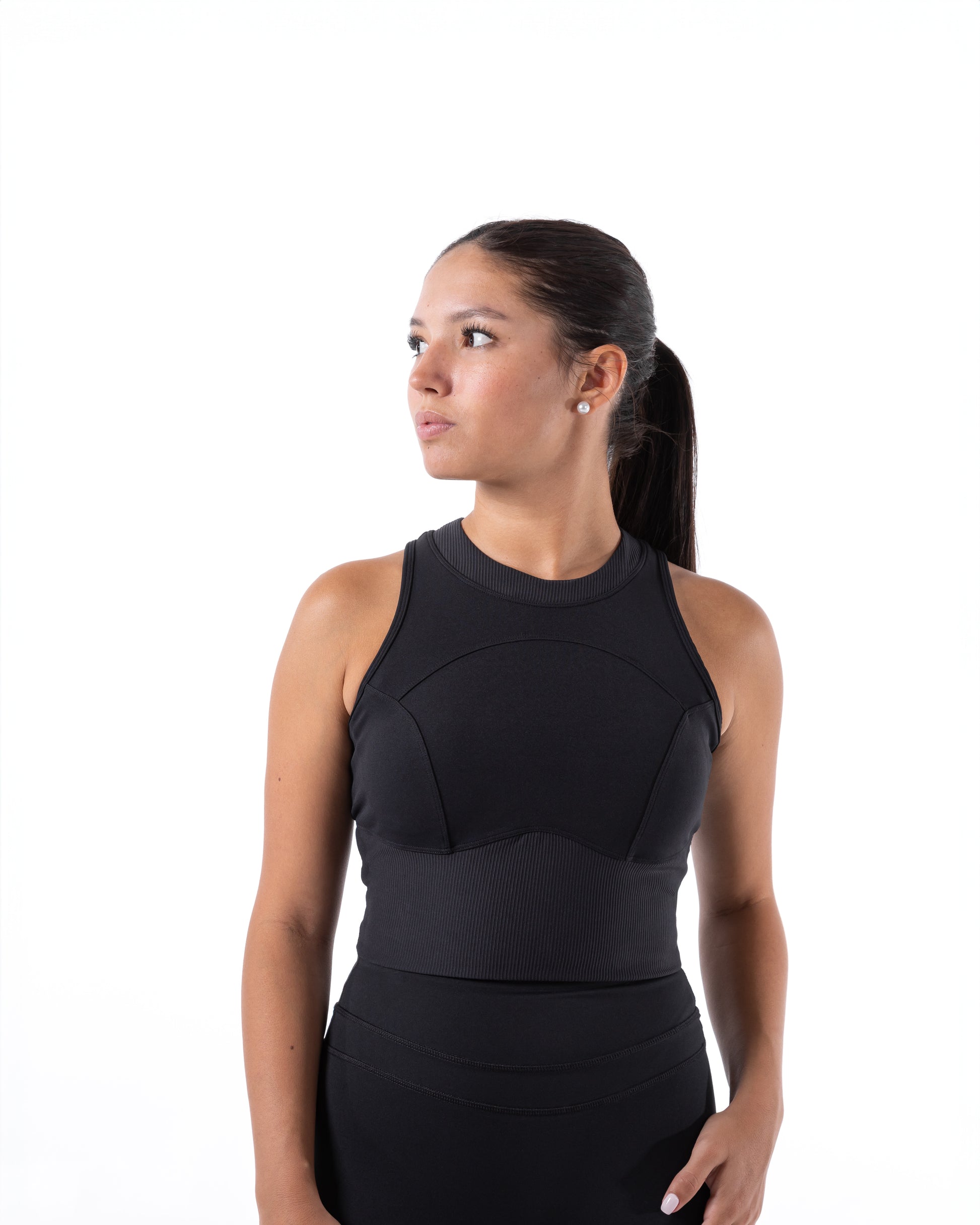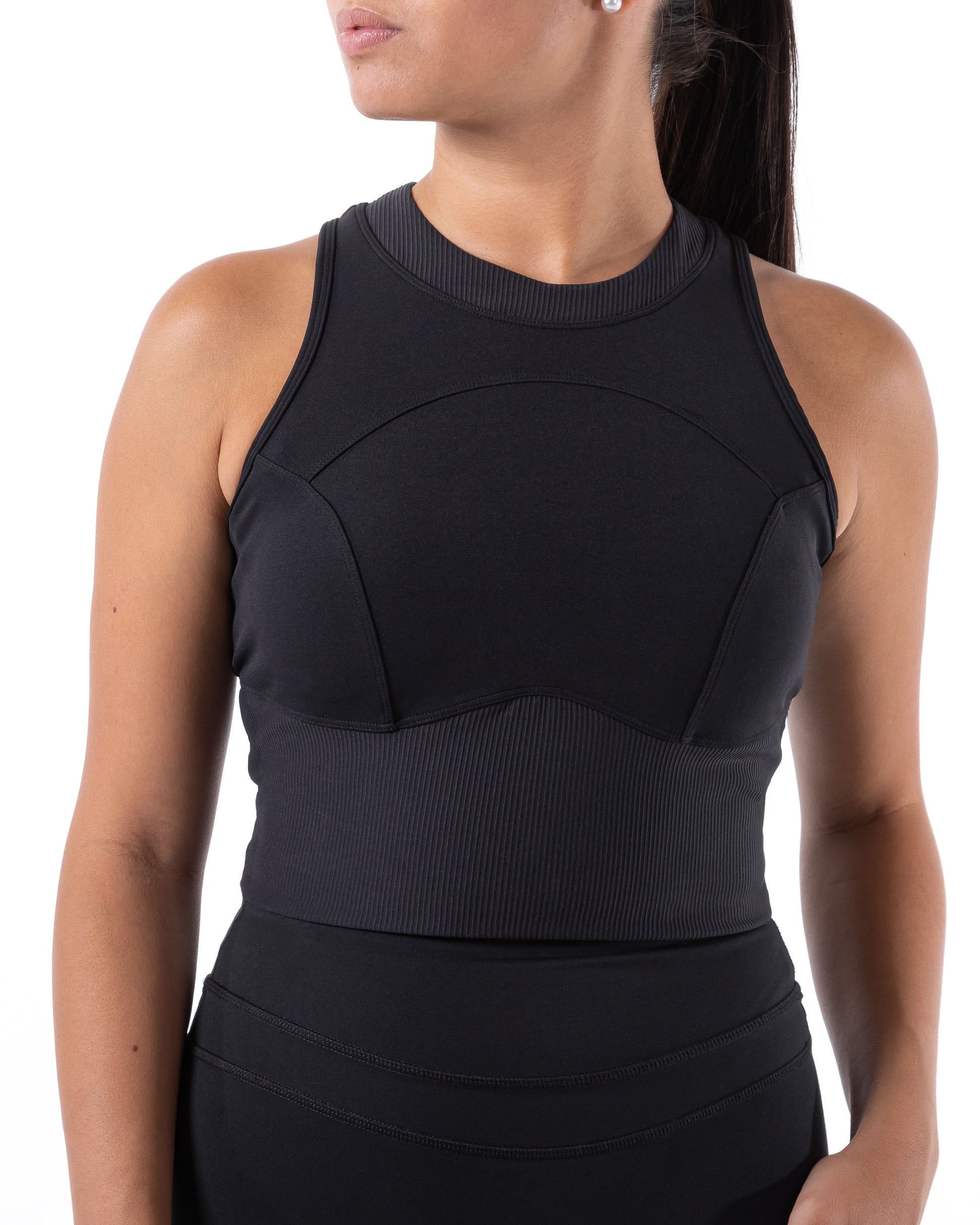 Ce débardeur présente des détails côtelés à l'encolure et à la taille pour une silhouette structurée et flatteuse. Les lignes profilées au niveau de la poitrine mettent en valeur les courbes naturelles, tandis que les coussinets intégrés offrent un maintien discret et un confort optimal. Avec sa coupe courte, ce débardeur se prête aussi bien aux séances d'entraînement intensives qu'à une tenue de tous les jours, pour un look élégant et soigné.