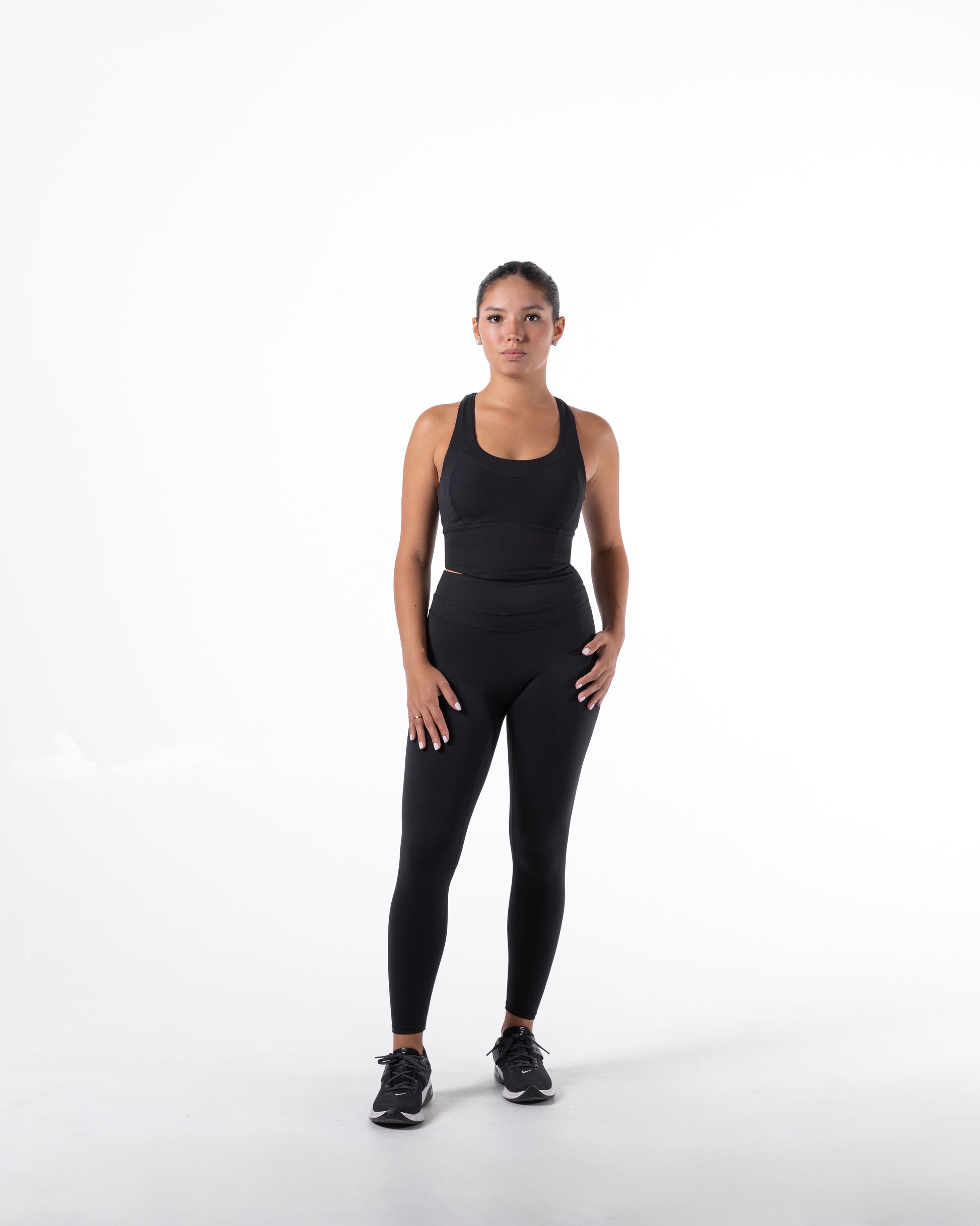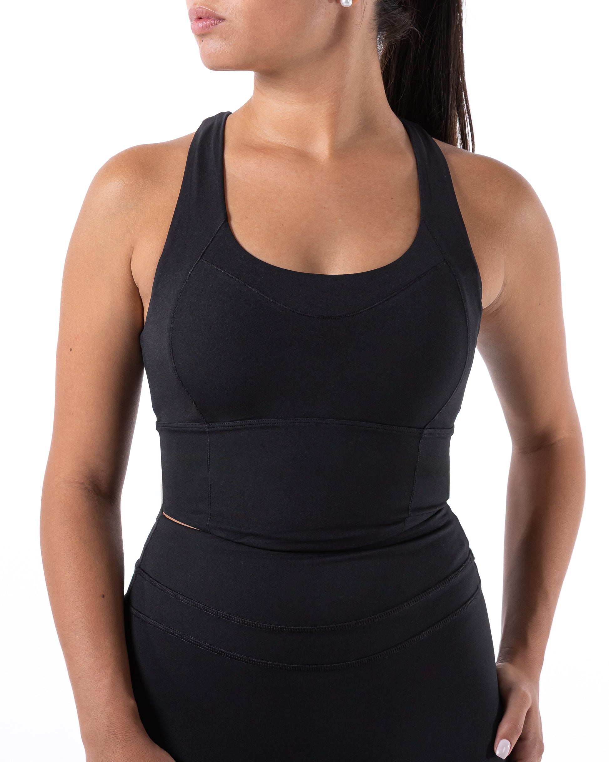 Crafted from serene fabric, this tank offers medium compression for a sculpted fit. A striking keyhole cross-back design adds a touch of elegance and breathability, while the sewn-in pads provide discreet shaping and support—eliminating the need for extra layers.